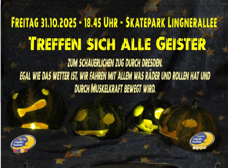 Liebe Superhelden, Gruftgeschöpfe und zauberhafte Figuren, sucht ein passendes Kostüm heraus – oder zückt Schere und Klebstoff! Am 31. Oktober treffen wir uns am Startplatz im Skatepark Lingnerallee und starten um 18:45 Uhr auf eine entspannte Halloweenrunde zum gemeinsamen Skaten – auf eure Kostüme freuen wir uns besonders! Ein Skateverleih ist nicht vorgesehen. Gefahren wird auch bei nasser Straße, die Strecke ist kurz und relativ einfach. Mitrollen darf alles, was Rollen / Räder hat und mit Muskelkraft angetrieben wird. Zum Schluss gibt es eine Monsterparty mit teuflisch leckeren Speisen am Lagerraum des Fördervereins! Wir freuen uns auf eure kreativen Kostüme! Euer Gruselverein Dresden skatet e. V…. #dresdenskatet #nachtskaten #bladenight #inlineskaten #inlineskating #inline #skates #freitagnacht #Dresden #stadtrundfahrt #halloween